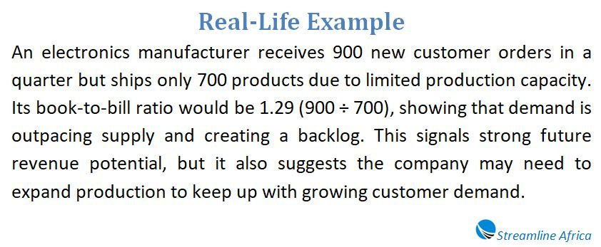 The meaning of the ratio depends on whether it’s above, below, or equal to 1. Each scenario reveals something different about a company’s situation: A ratio above 1 means demand exceeds supply. This can be positive for future growth but may also highlight capacity constraints. For instance, if a company books 1,000 orders but only ships 800, it has a ratio of 1.25. The excess orders become backlog, which could translate to future revenue. A ratio below 1 means supply exceeds demand. This may indicate slowing business activity. If a company ships 1,200 orders but books only 900, the ratio is 0.75. That suggests the company is clearing old orders and may face fewer incoming sales in the near term. A ratio equal to 1 means supply and demand are balanced. When bookings match billings, companies are meeting customer needs efficiently without building up a backlog or falling behind.