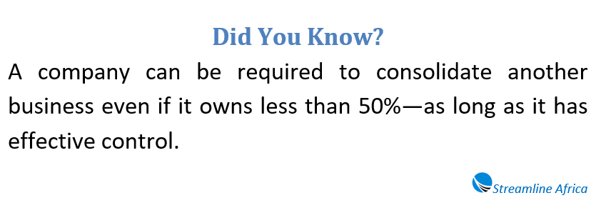 Suppose Horizon Manufacturing Ltd. in Accra owns 80% of a packaging company in Kumasi. Even though the packaging company operates separately, Horizon controls its strategic direction. From a financial reporting standpoint, the two are treated as one economic entity.