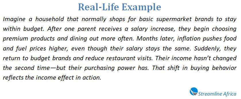 Let’s say the price of rice increases significantly, but pasta prices stay the same. Many consumers might switch from rice to pasta, not because they now earn more or less, but because they want better value for their money. The substitution effect leads people to replace one good with another that serves a similar purpose, especially when their budgets are tight.