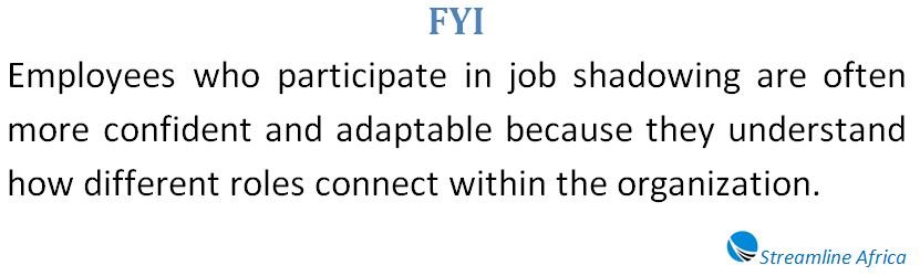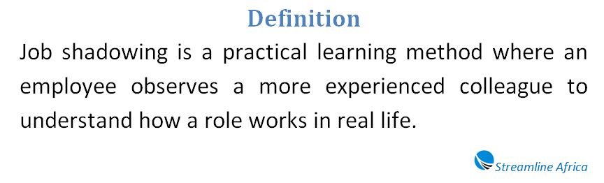 - Job shadowing allows employees to learn by observing experienced colleagues in real work situations.
