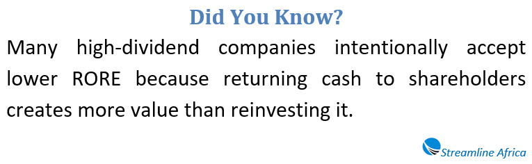 A strong RORE indicates that each unit of profit retained is producing a meaningful increase in future earnings. In contrast, a weak RORE suggests that retained funds are not generating sufficient returns, raising the question of whether shareholders would be better served through higher dividends instead.
