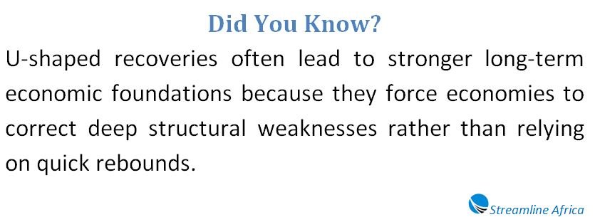 In most cases, a U-shaped recovery emerges after a recession caused by deep-rooted problems in the economy. These may include excessive debt, structural inefficiencies, inflationary pressures, or prolonged financial instability. Because these issues cannot be resolved quickly, economic activity remains muted even after the initial downturn ends.