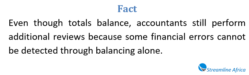 It confirms that debits equal credits but does not catch every mistake. Errors like omitted transactions or incorrect classifications can still exist, requiring further review and reconciliation.