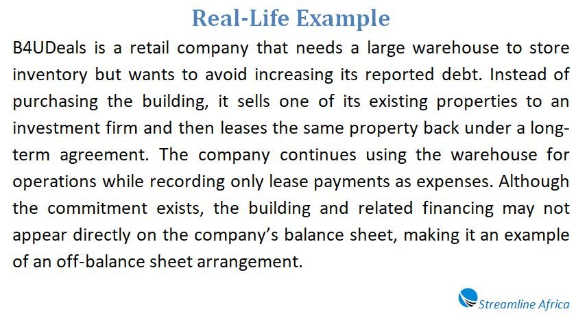 Off-balance sheet activities are financial commitments or resources that don’t appear directly on the balance sheet but still influence a company’s position. They include items like operating leases, leaseback deals, accounts receivable factoring, and SPEs. While legal and often practical, they carry risks of misuse.