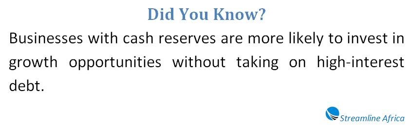 It provides a financial cushion during slow sales periods, delayed customer payments, or unexpected expenses. Having accessible reserves allows a business to continue operating smoothly without relying on debt.